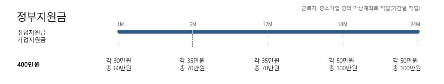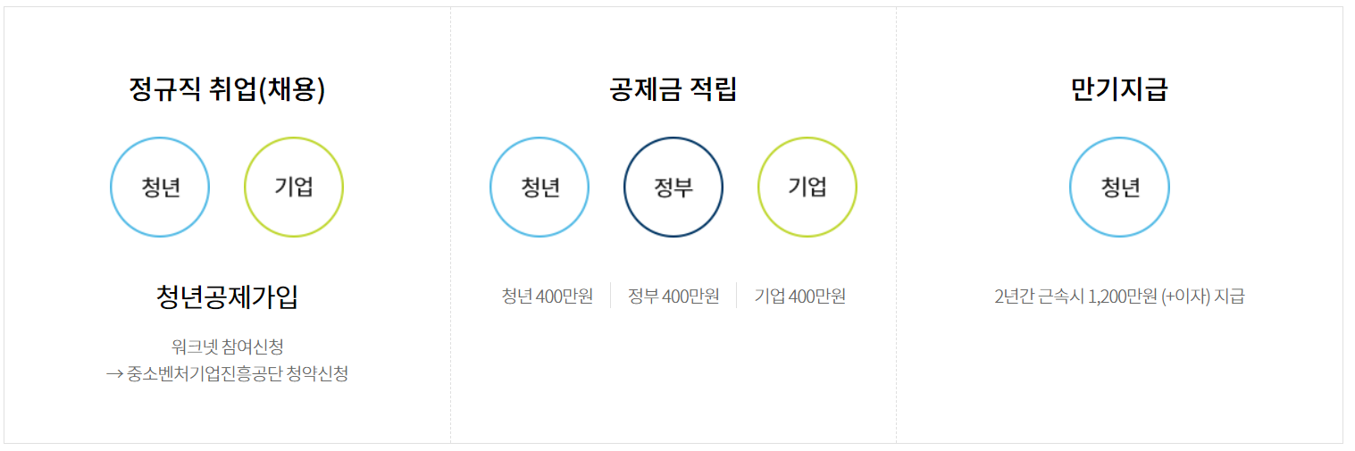 - 5인 이상 50인 미만 제조·건설업종 중소기업에 취업한 청년이 2년간 400만원을 적립하면 정부가 400만 원, 기업이 400만 원을 공동 적립하여 만기 시 1,200만 원의 목돈 마련
